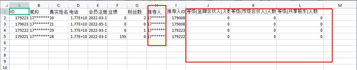 4. 后台团队客户页面:导出增加推荐人、业绩、团队中经销商等级人数显示
