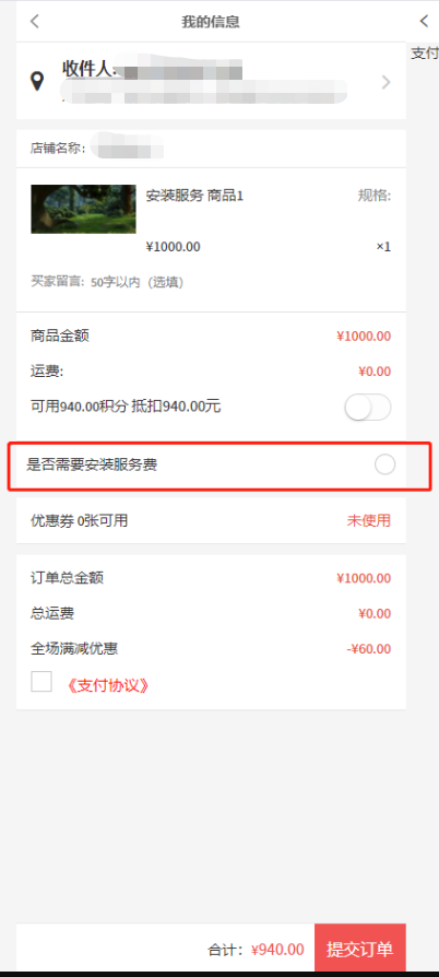 1. 2.在前端下单页选择是否需要上门安装,勾选则订单总价会加上服务费,如选择不需要则订单价格就是商品价格。