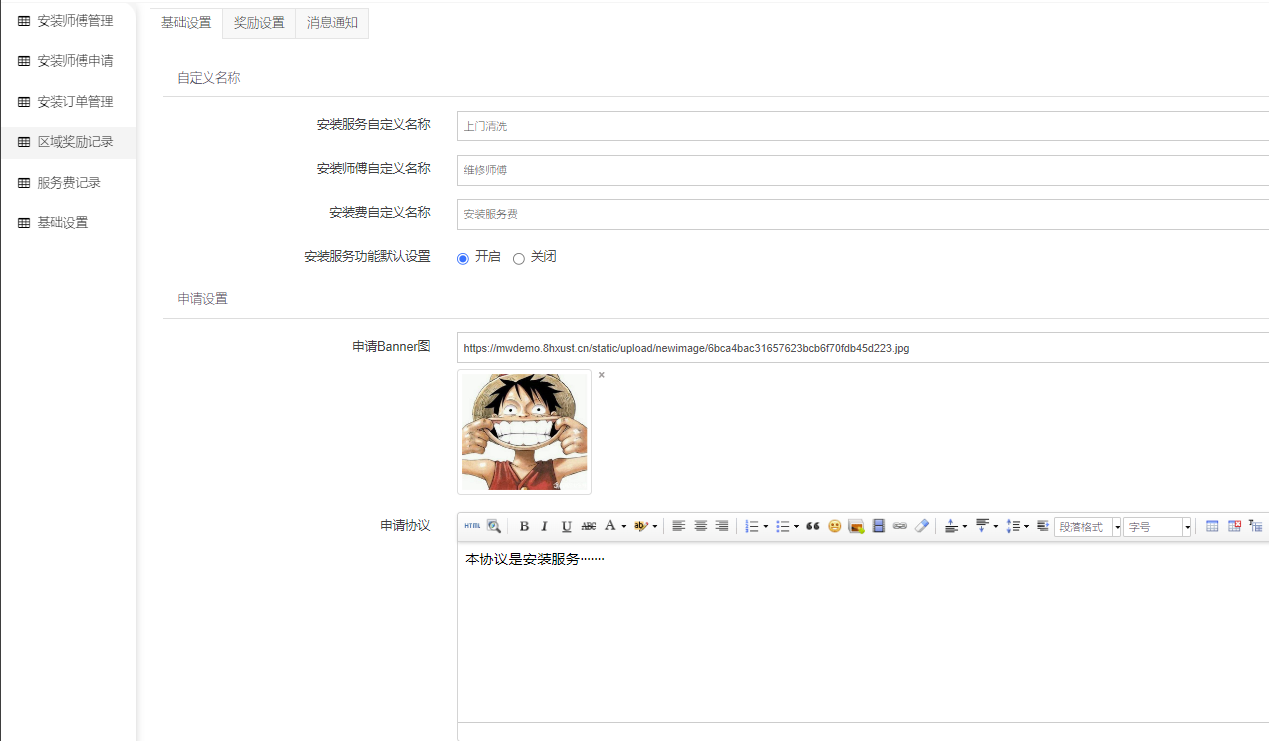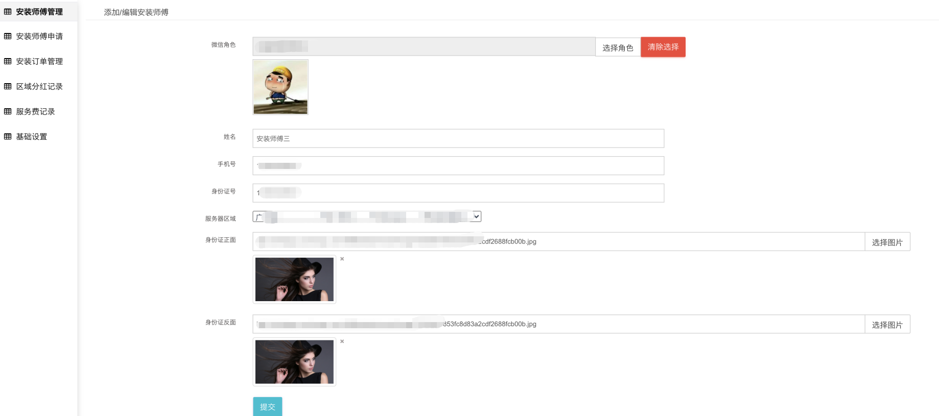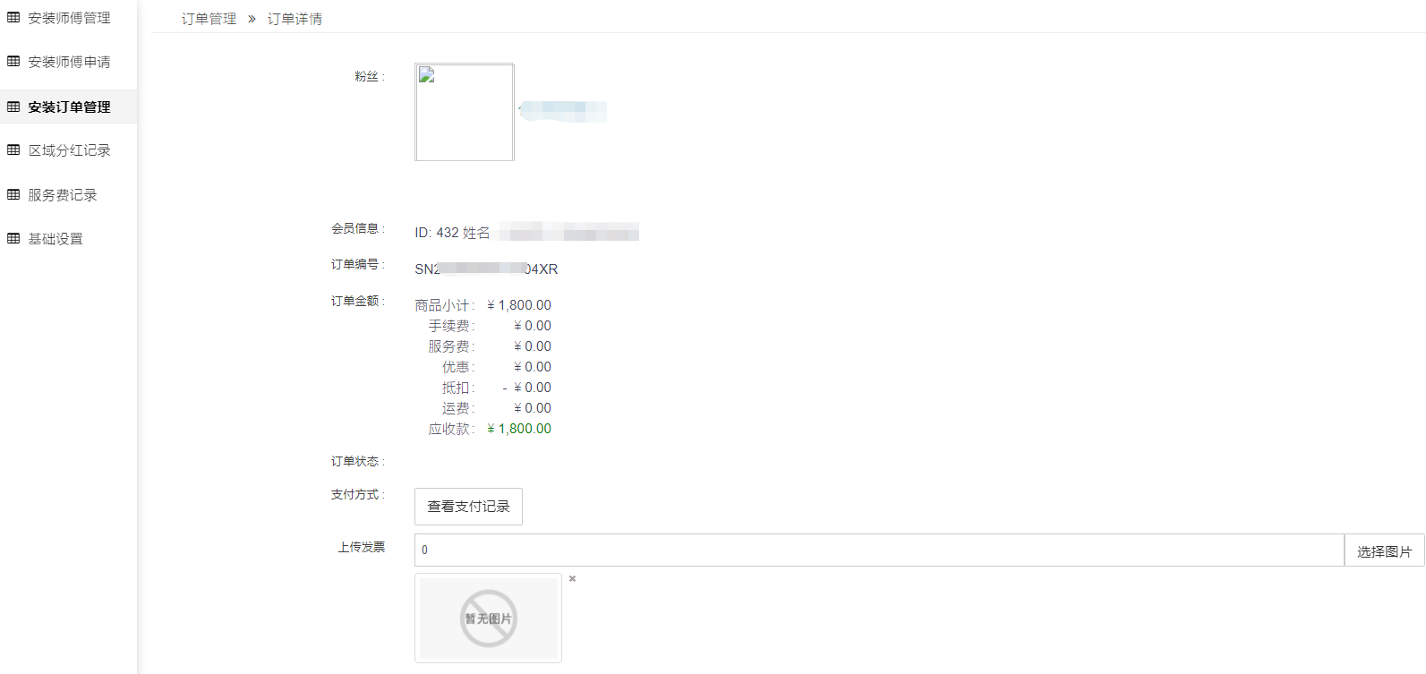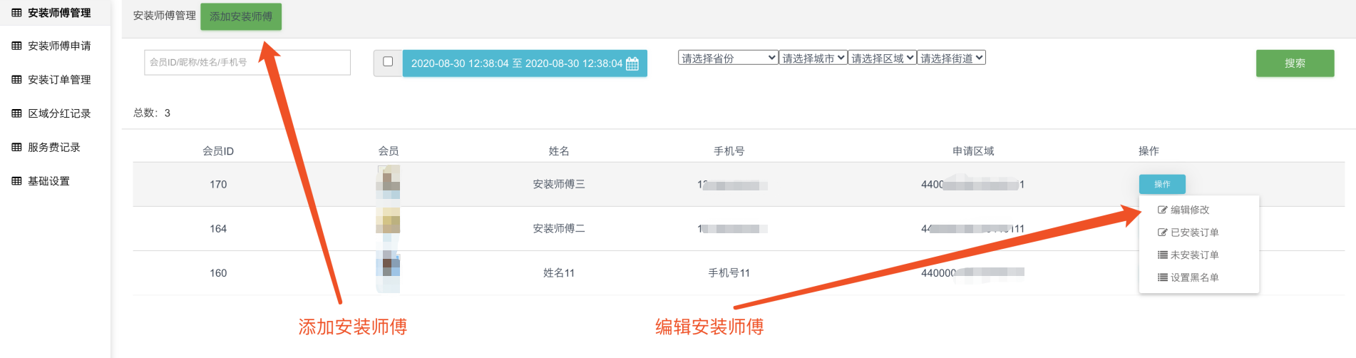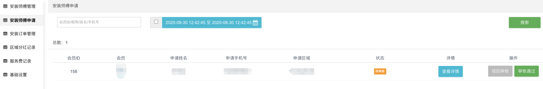 4. 申请被通过审核后台,会员中心入口变为安装服务和安装师傅