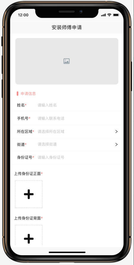 2. 安装师傅申请页面可后台设置顶部背景图,除备注信息外其他选项必填