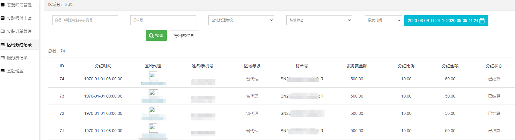 区域代理分红比例(根据订单地址判定是哪个代理获得分红)(安装完成进行结算)
