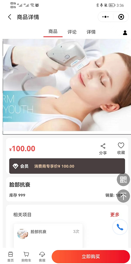 项目商品:显示包含该项目的所有预约商品,会员购买商品后即可获得预约次数。