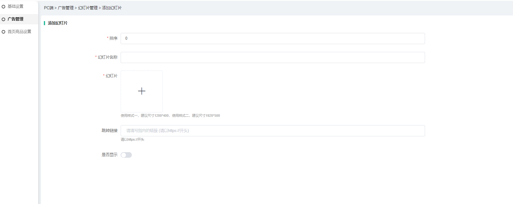 1、幻灯片:幻灯片创建ID,幻灯片名称、图片、是否显示、编辑或删除。