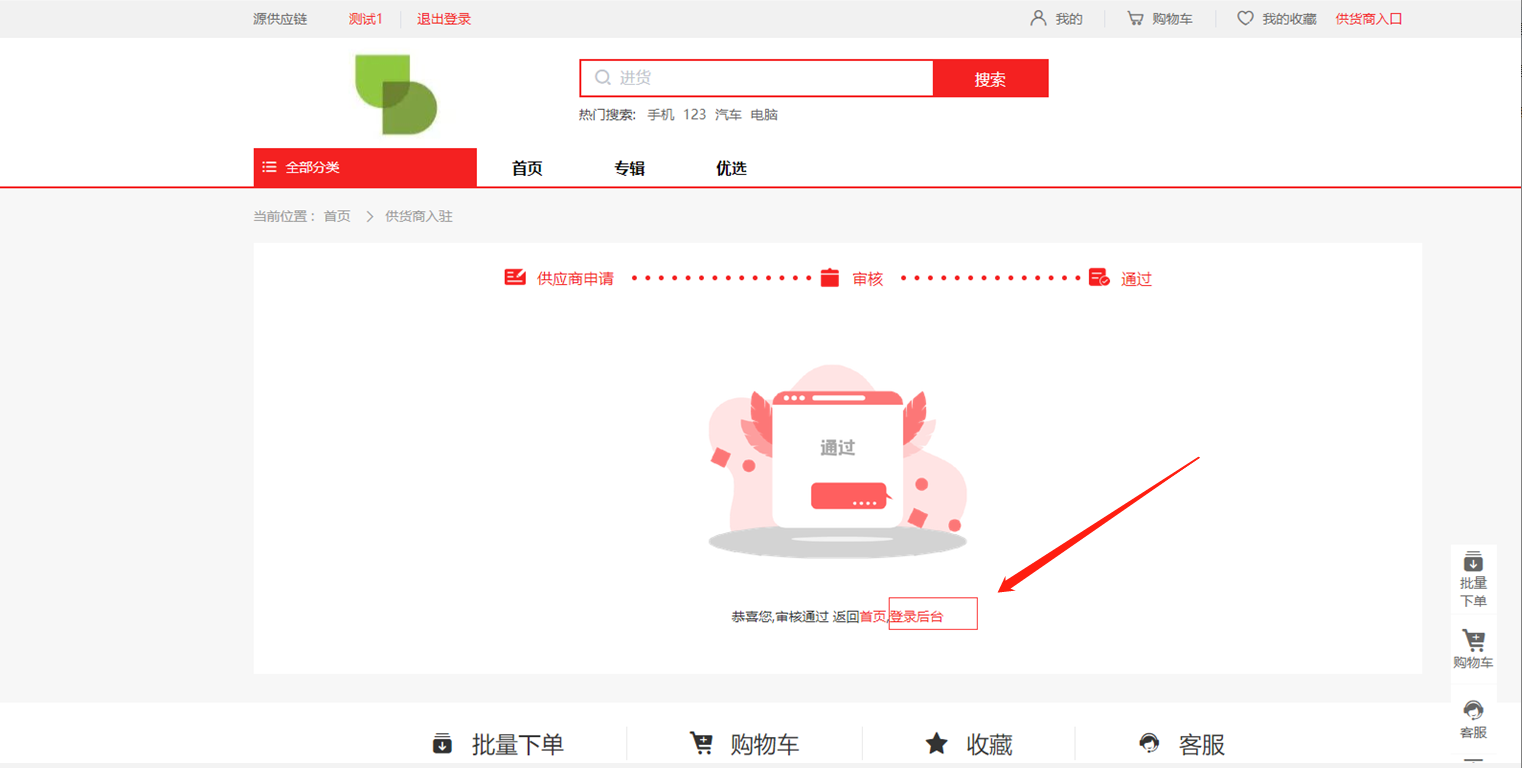 3.后端登录地址:填写供应链中台登录网址,供应商申请通过之后,可以点击跳转后台页面登录,如