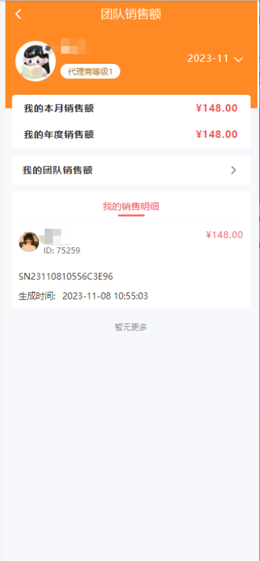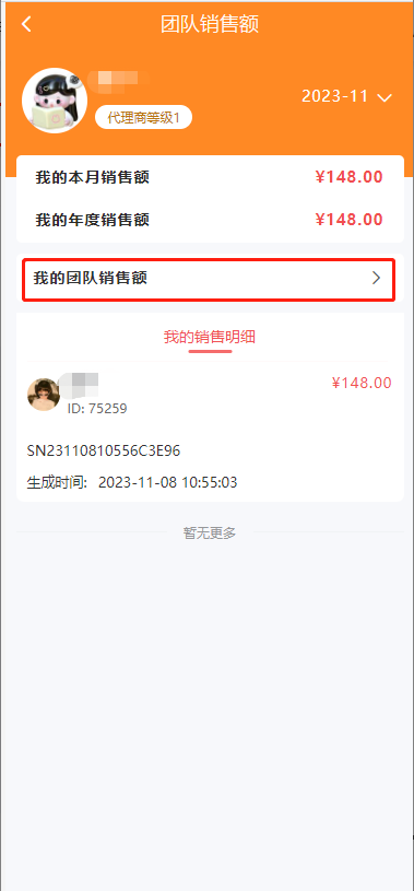 3、团队销售额(会员中心):记录代理商本人:年度销售额,当月销售额,销售额统计明细。可以根据时间筛选变更年度销售额,当月销售额,销售额统计明细
