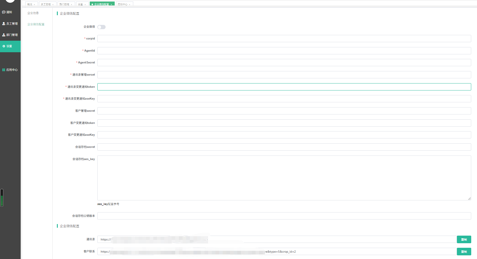 2、配置企业微信/创建应用/通讯录/客户管理等参数设置