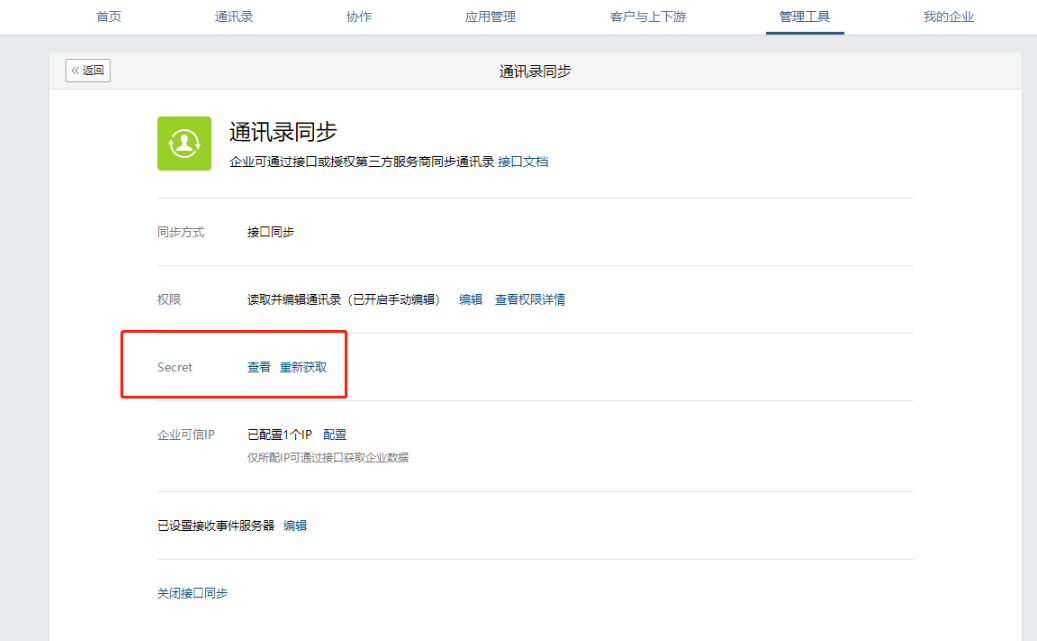 (注意:如果没有配置企业可信IP的入口,可点击关闭接口同步,再开启就有了)