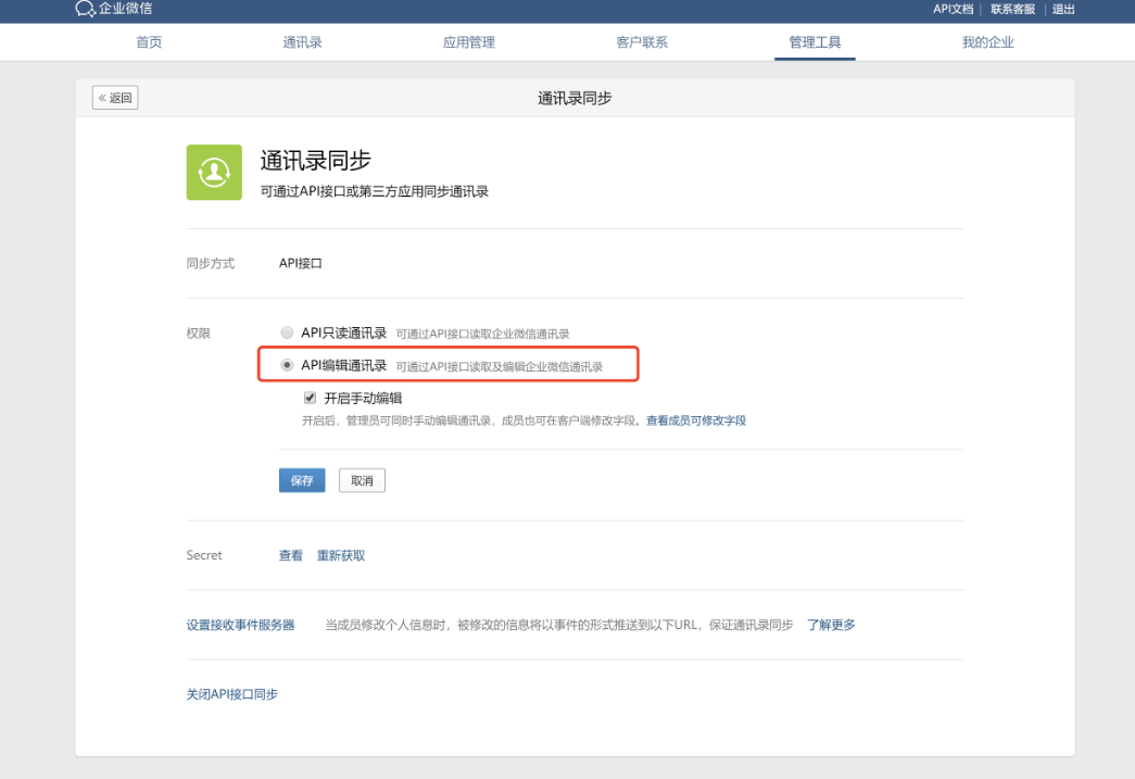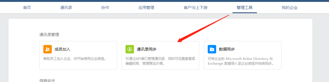 企业微信官方后台 -- 管理工具 -- 通讯录同步