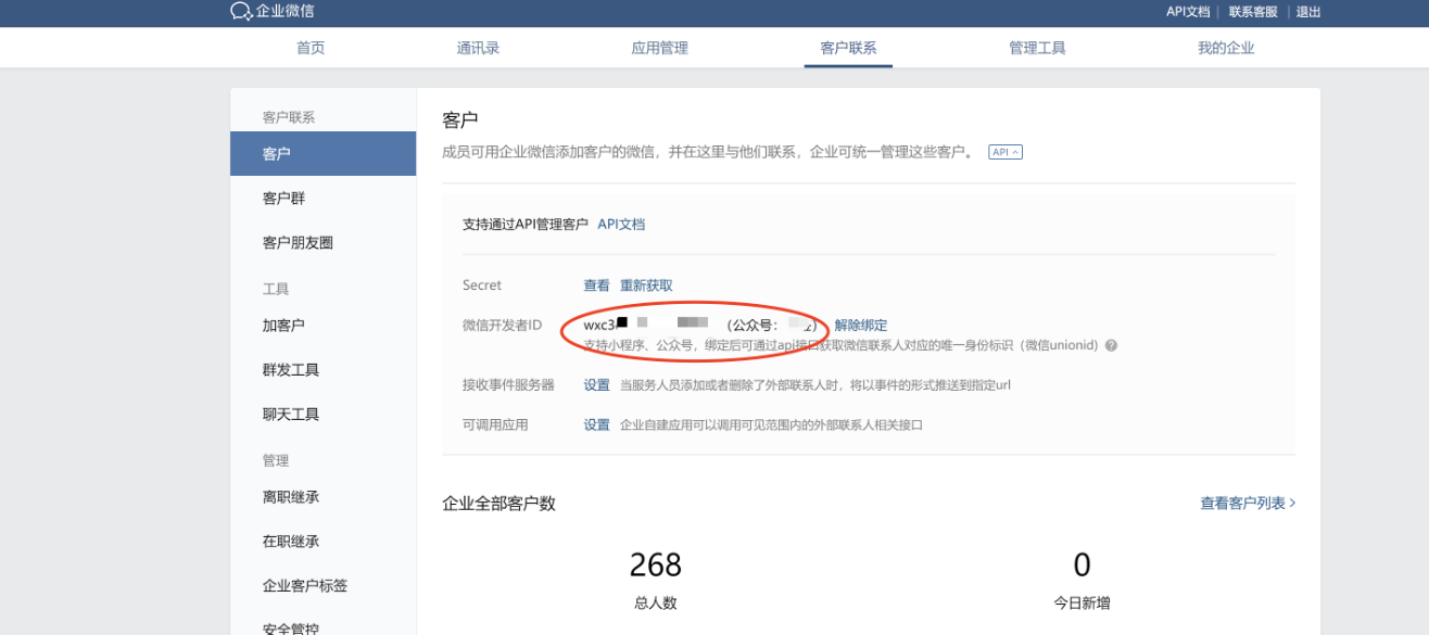 进入客户联系--客户,点击API--微信开发者ID--绑定,如下图: