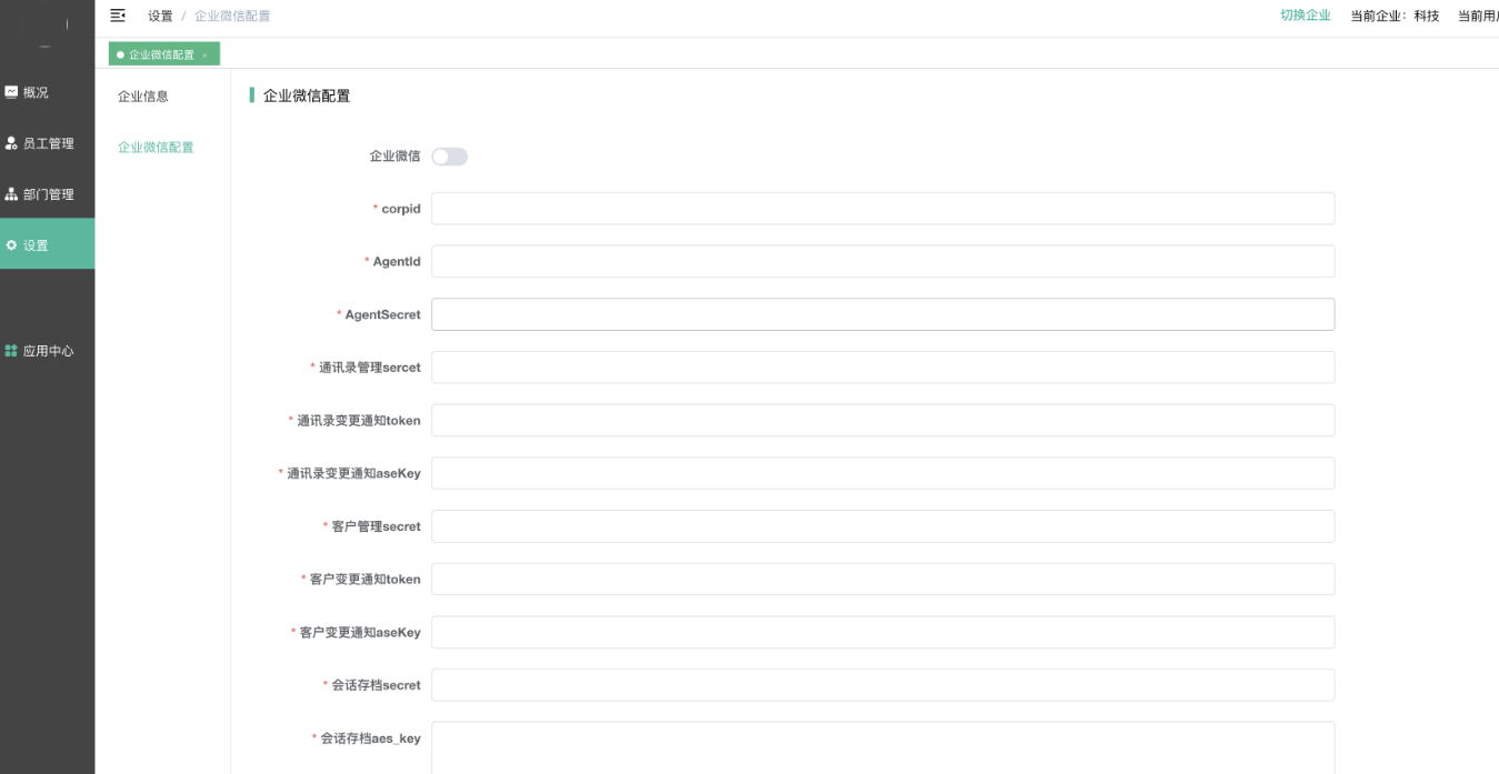 - 设置:查看当前企业具体信息、配置企业微信信息;