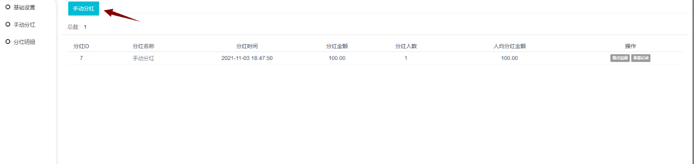 列表显示分红记录,操作查看备注信息和查看记录,点击手动分红可以创建新的分红。