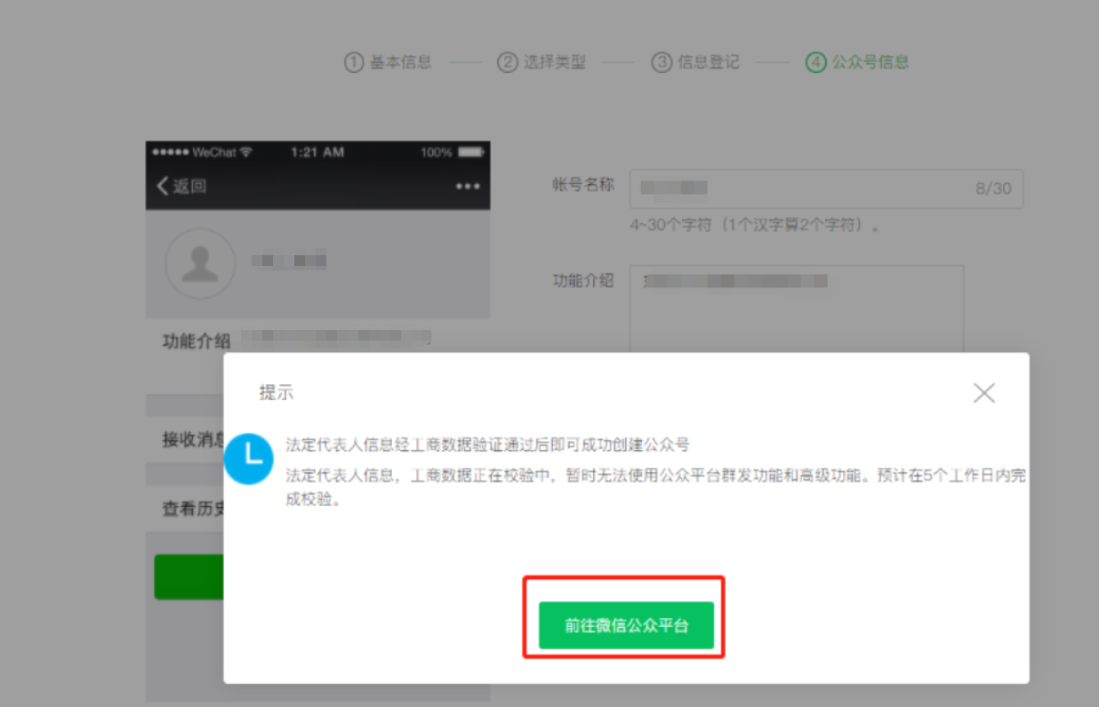 3:点击“下一步”,确认填写信息,在此处可以更改刚才的公众号名称,确认后需要等下次年审的时候再更改。