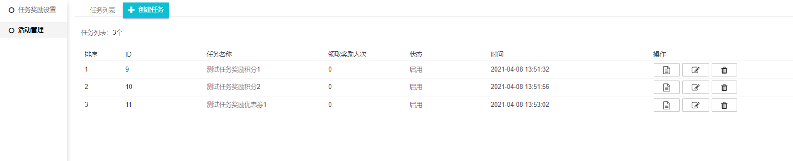 任务奖励:后台创建活动,活动里添加任务,满足任务设置的条件就可以获得奖励,奖励需要到前端会员中心领取。