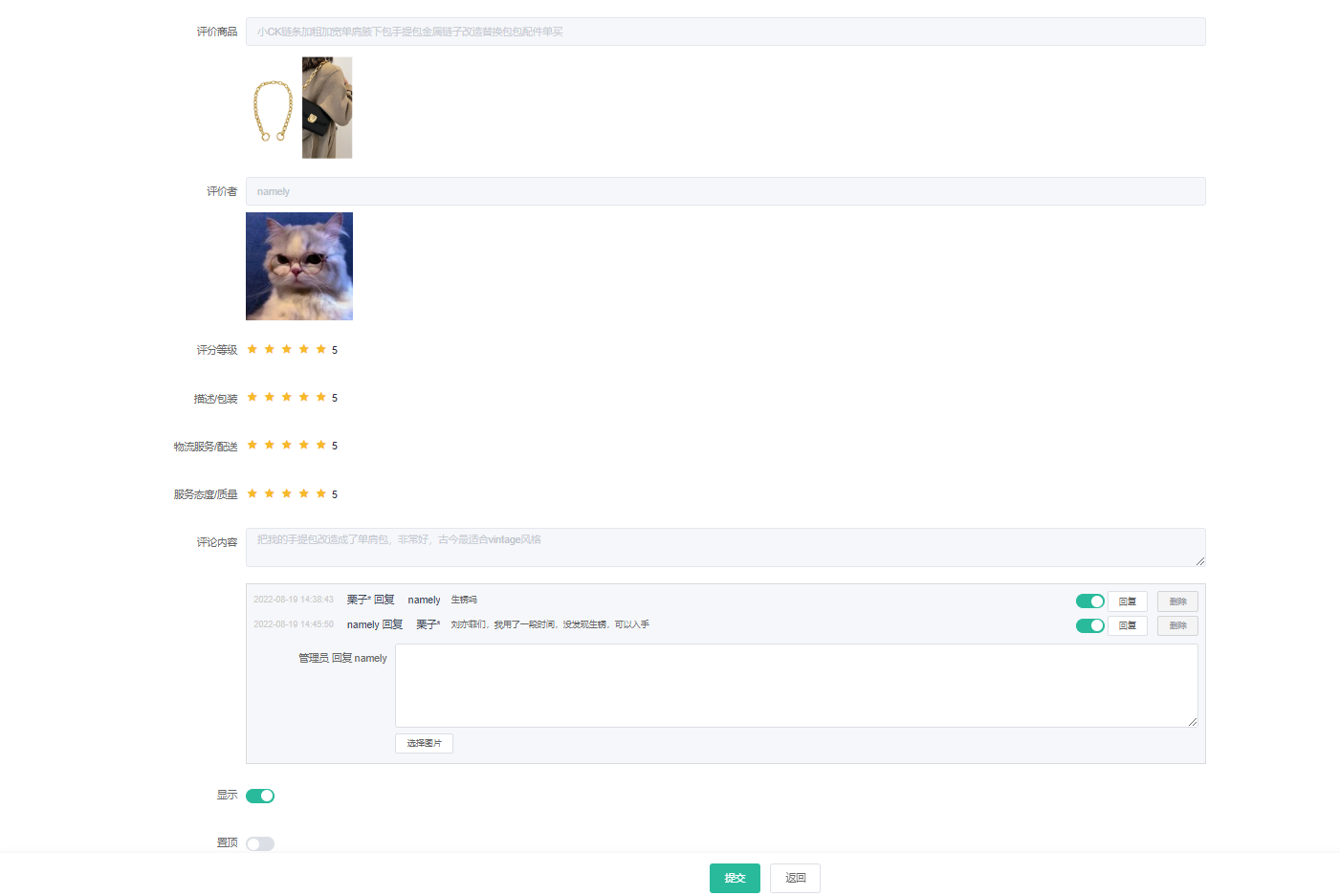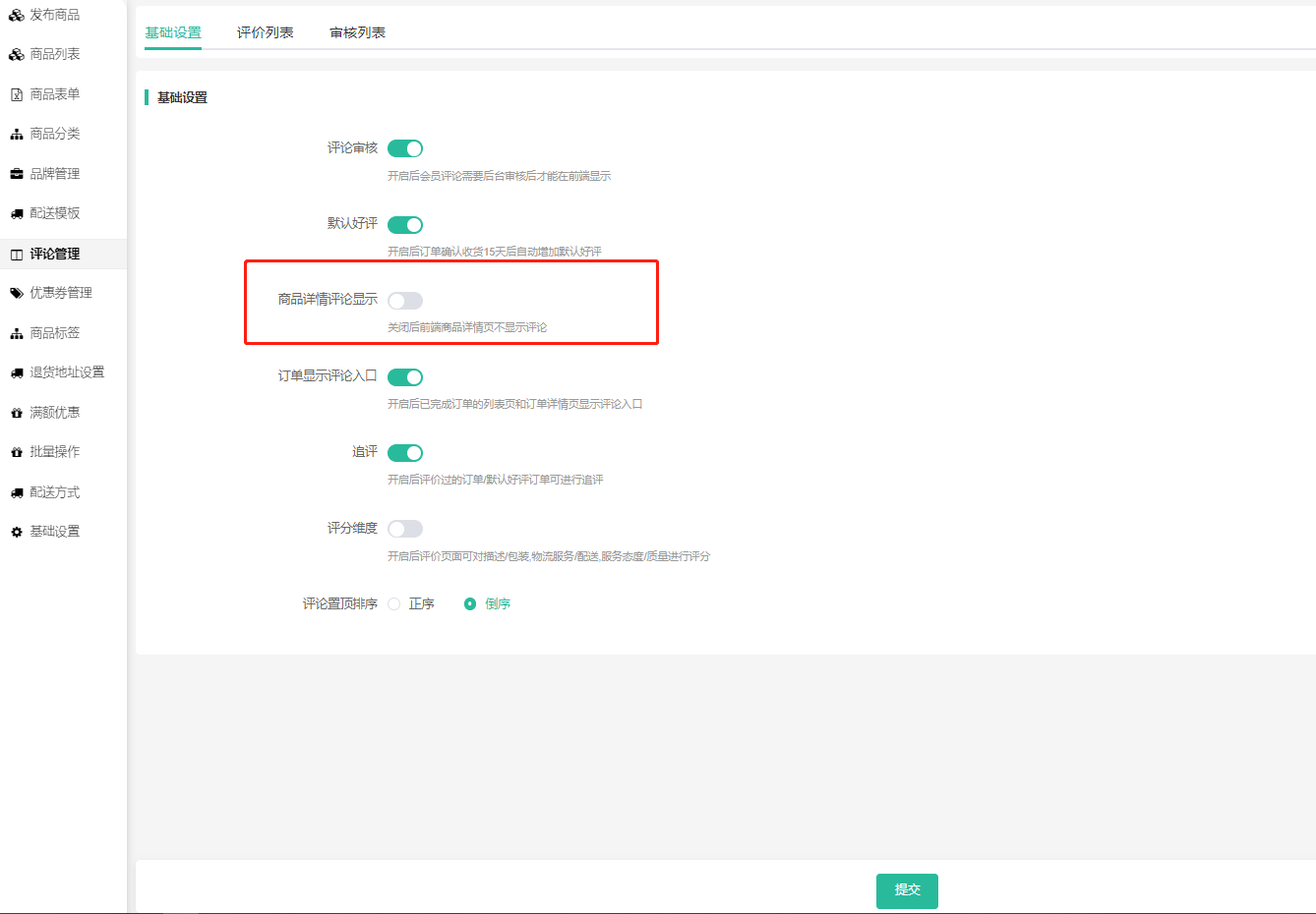 开启后会员评论(首次评价、追评)需要后台审核后才能在前端显示。用户对主评论的回复不用审核,可直接显示。