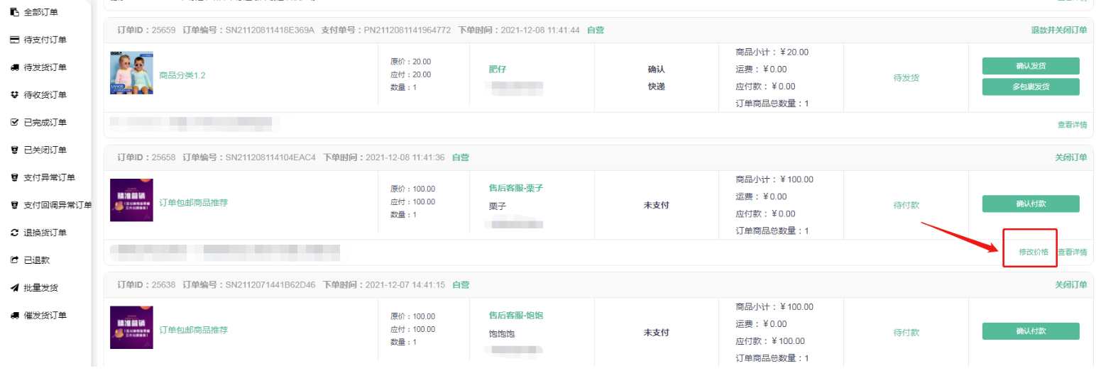① 订单改价:可以加价或减价,修改后,买家以修改后的价格金额为最终实付款