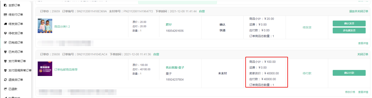 确认修改价格后,未付款订单会显示改价后的金额