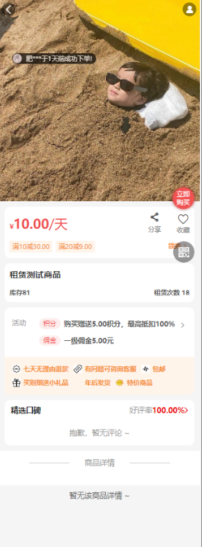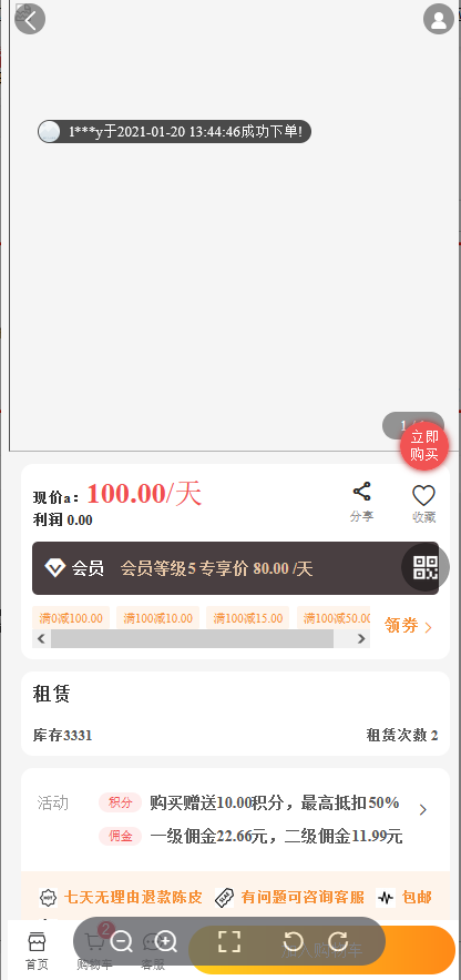 平台发布商品,设置为租赁商品,用户即可按照天数租赁商品使用,租赁需要先支付押金,用户归还商品后即可退还押金至余额。