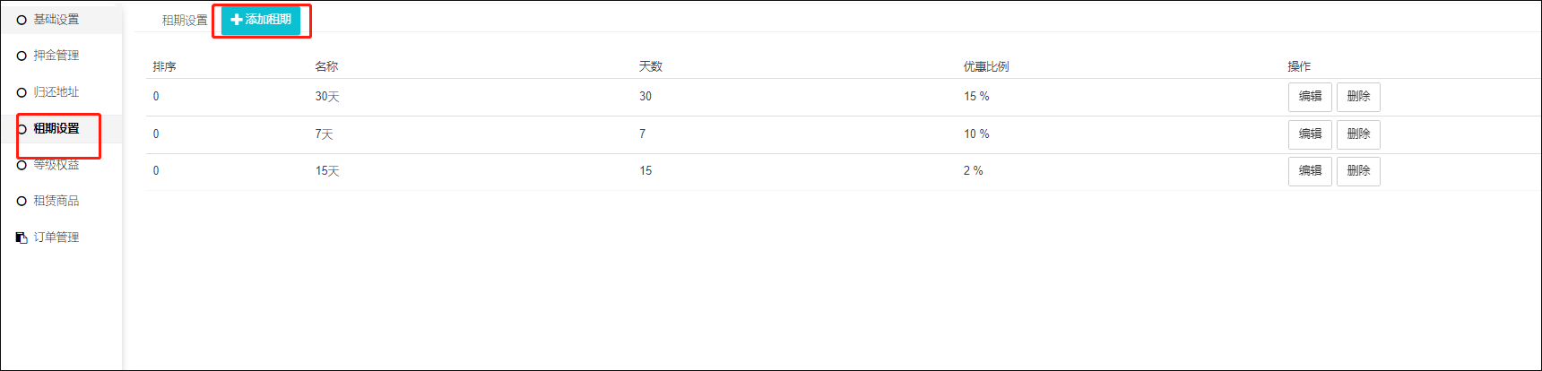 添加租期后,用户租赁下单是可以快速选择租期,并且享受对应租期的优惠;用户也可以自定义设置租期,自定义设置的租期优惠按照小于设置的租期最接近的一个优惠执行。