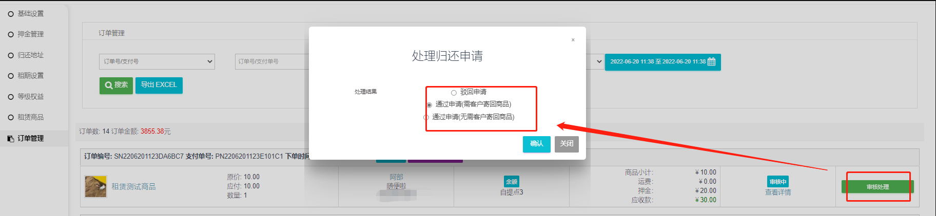 退还流程:用户订单中申请退还--后台审核退还申请--用户退还商品、填写退还物流信息--后台确认退还,填写逾期、破损扣除金额及说明,设置退还方式(支持退还到余额、手动退还)--确认退还--押金按照选择的退还方式退还。