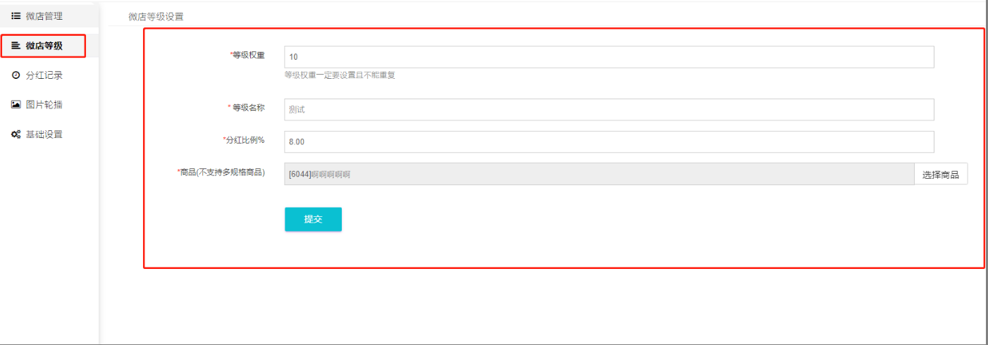 分红比例:该等级店主默认获得的商品分红比例,商品中支持设置独立的分红比例,商品独立分红比例计算级别优先于等级默认比例。