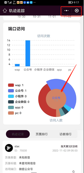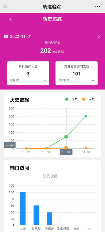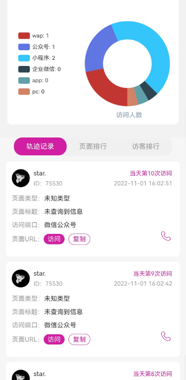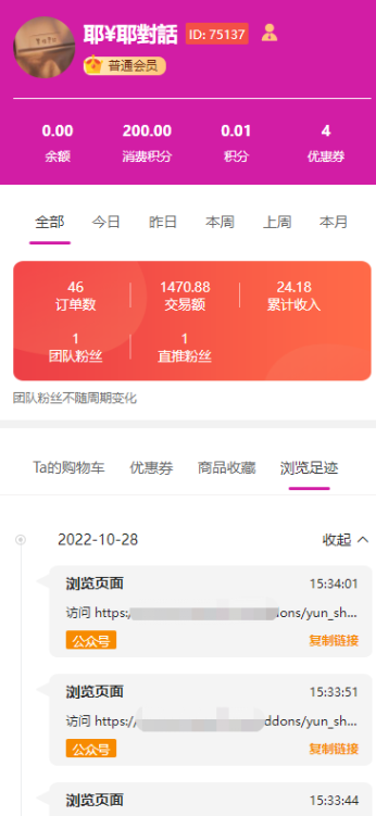 使用场景:会员(推客/员工)在手机前端可以查看下线客户的信息及浏览轨迹