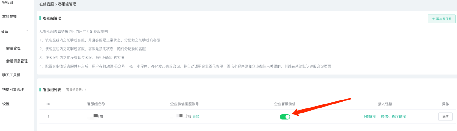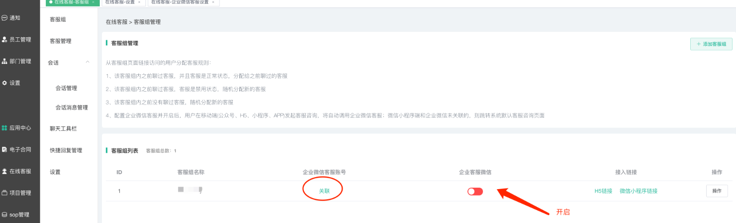 在在线客服--基础设置--企业微信客服设置中进行接口配置,配置好之后即可在客服组开启企业微信客服。