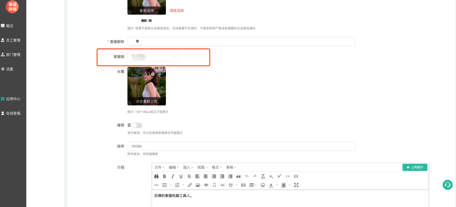 在添加/编辑客服时,可以将客服设置为某一个分组,如下图: